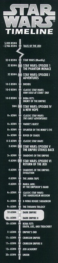 Besides the timeline in the image above, I also follow two other timelines (v2.0 and v2.1) based on how Dark Horse Comics sells their comic books which are based on more general classifications. Further, while any Star Wars geek could figure all this out but if your only exposure is to the films, then searching the Web will get you more info than you probably ever want. I do have a preference for Wookiepedia. There's no need to be intimidated---the stories are all self contained and are about characters with a rich mythology than in the movies (which is also an ambitious father/son story).