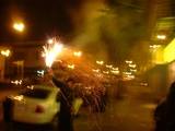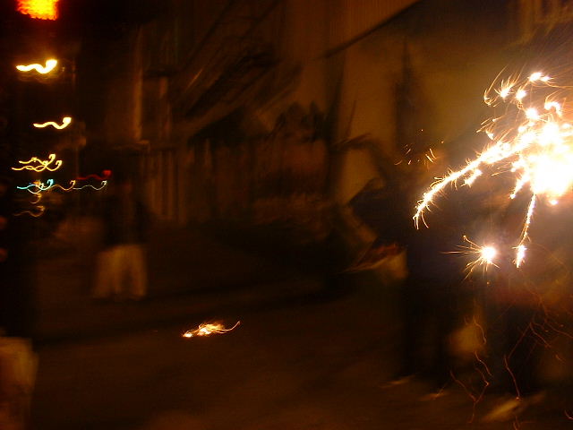 Finally, as dusk settled in, we (now including Bagus, Crash, and Raj) decided to drive up the hills of Millbrae to find a good spot to set off the fireworks. Failing to do so, we then headed out to Twin Peaks. After watching a bit (with emphasis, given the fog) of fireworks across the horizon in Berkeley, Oakland, and San Francisco, and struggling to light our own in the nippy wind, we headed down to Mission. We walked up and down Mission street, setting off an assortment of fireworks on the foot path and the street, including smoke balls of different colours, spinners, sparklers, fountains and cones. None of them were the aerial or the explosive kind (not permitted by California law), though it is still surprising we were not stopped by the police (given the mayhem we were creating).